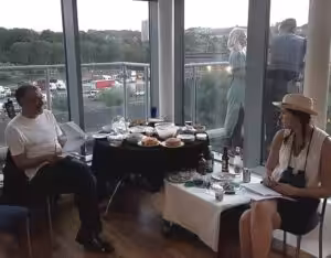 Alan and Corey inside (with Janis and Cornelius on the balcony outside)