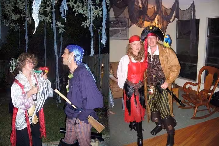 The first pic is of my sis and a friend playing Dr. Sawbones — note the stethoscope made out of cut bamboo links and rope (he’d go up to the woman and get them to ask how it worked so they’d put it to their chest — one time, on me actually, Hal said "that’s not working" and Dr. Sawbones looked up with a grin and in his best pirate voice said, "Arrrghh, it be workin’ FINE!") and the cannon in the background. Besides the cannon, we had a store-bought game that you’d hold onto and was like musical chairs, if you let go too soon it would shock you and you lost or if you were the last one after the music stopped it shocked you and you lost. The second is James and me and I want you to take special note of James’ codpiece — we made it out of an ornamental eggplant you get at Gardenridge and painting it gold and adorning it. It was a hit at the party.