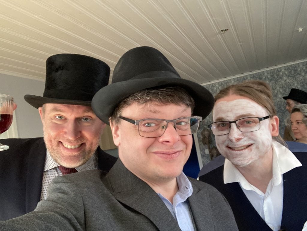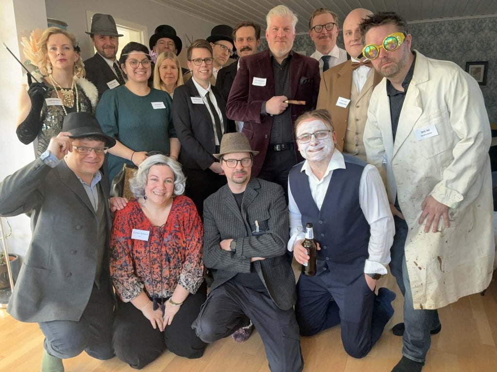 A Haunting in Hartwick is a ghostly murder mystery game for 11 to 13 guests and one host. It is set in a grand manor house in the 1920s. Download the free introductory pdf file.