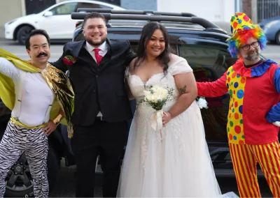 Our Dana, Dmitri, and Vladimir were all traveling to the party together and found a parking spot in front of a church, a couple of blocks from my house. It just so happens that there was a wedding going on, and the bride and groom were leaving the church just as our Big Top performers were getting out of their car, and the happy couple insisted on getting a photo with them.