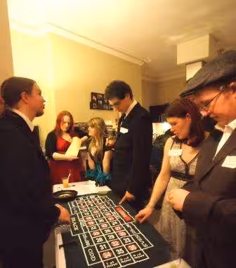 “We managed to cram all 22 people into my teeny tiny one reception room-one bedroom-one bathroom flat, which was quite a challenge but worked out fine in the end. We spread the furniture out to create as much floorspace as possible. I played the role of barmaid and set up a bar in our kitchenette – serving only the finest French cocktails of course! I also put out a bit of ‘finger food’ – French baguettes, cheese, mini pastries and the like! We had a poker table and a roulette table, and the two guys playing croupiers Joe Knowall and Chris Rowan got right into character tending the tables, without any prompting from me at all!