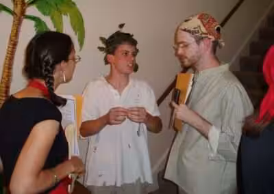 “My church “youth” group (ages 15-30) recently played A Dead Man’s Chest, and the game was a big hit! My husband and I decked out our apartment to look like a tropical island, and we ate lunch together and launched into the game. I was surprised at how much everyone got into their characters; forming teams and then double-crossing each other, speaking in funny accents, holding emergency meetings in the bathrooms, and so on. The British rocked the game in our particular version — they allied early with the Indians and several of the pirates to make sure they met their goals. Bill Pistol crawled under the dining room table in fear whenever a nobleman approached him, Cassinga managed to scare several people into actually volunteering to be sacrificed to the volcano, and the “Governor” had a great time making everyone bow to him and compliment England before approaching to speak with him (which of course ruffled Don Inigo’s feathers). About half of the players knew who the murderer was by the end of the game, but no one dared lift a finger against them; this person had gotten themselves so well-allied that they were quite untouchable!